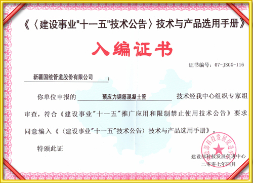 建設(shè)事業(yè)十一五技術(shù)公告技術(shù)與產(chǎn)品選用入編證書