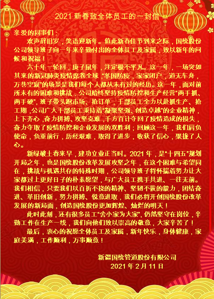 您現(xiàn)在的位置: 新疆國(guó)統(tǒng)管道股份有限公司 > 新聞中心 > 公司新聞 > 正文