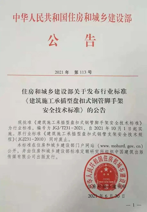 由公司控股子公司安徽卓良新材料有限公司參編的新版《建筑施工承插型盤扣式鋼管腳手架安全技術(shù)標(biāo)準(zhǔn)》于2021年10月1日起正式實施!
